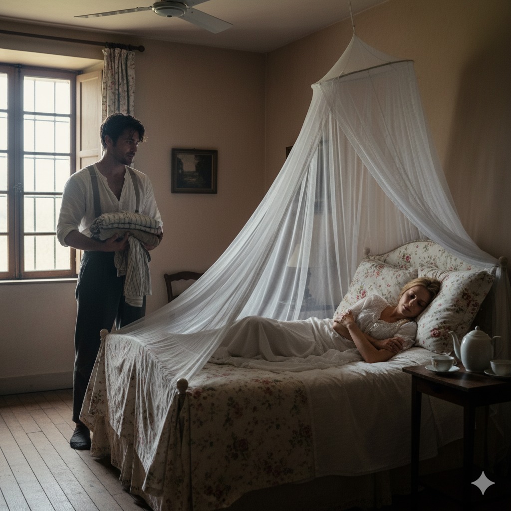 Con la tenue luz que entraba por la ventana, distinguió la silueta de Don Manuel. Ella se acercó despacio y levantó con cuidado la manta que cubría a su nuera.