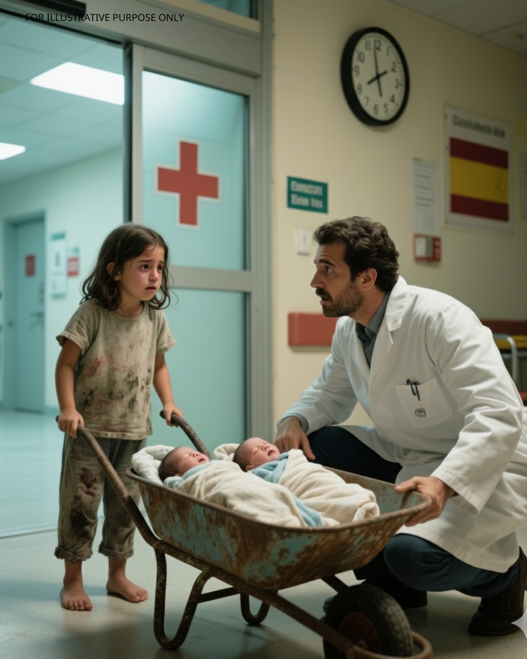 Cuando las puertas automáticas se abrieron de golpe aquella mañana, la enfermera de triaje se quedó paralizada. Una niña —de no más de siete años— empujaba una carretilla oxidada a través de la puerta. Dentro, envueltos en una manta fina, había dos recién nacidos , pálidos pero respirando.